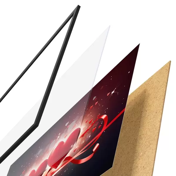 De poster bestaat uit een frame, plexiglas, geprinte afbeelding en spaanplaat achterkant. De poster kan meteen aan de muur worden gehangen dankzij de bevestigingen op de achterkant.