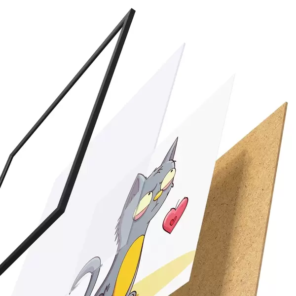 De poster bestaat uit een frame, plexiglas, geprinte afbeelding en spaanplaat achterkant. De poster kan meteen aan de muur worden gehangen dankzij de bevestigingen op de achterkant.