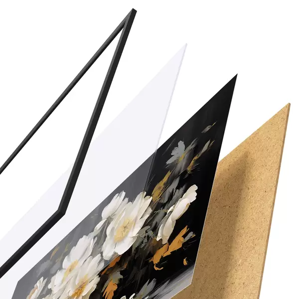 De poster bestaat uit een frame, plexiglas, geprinte afbeelding en spaanplaat achterkant. De poster kan meteen aan de muur worden gehangen dankzij de bevestigingen op de achterkant.