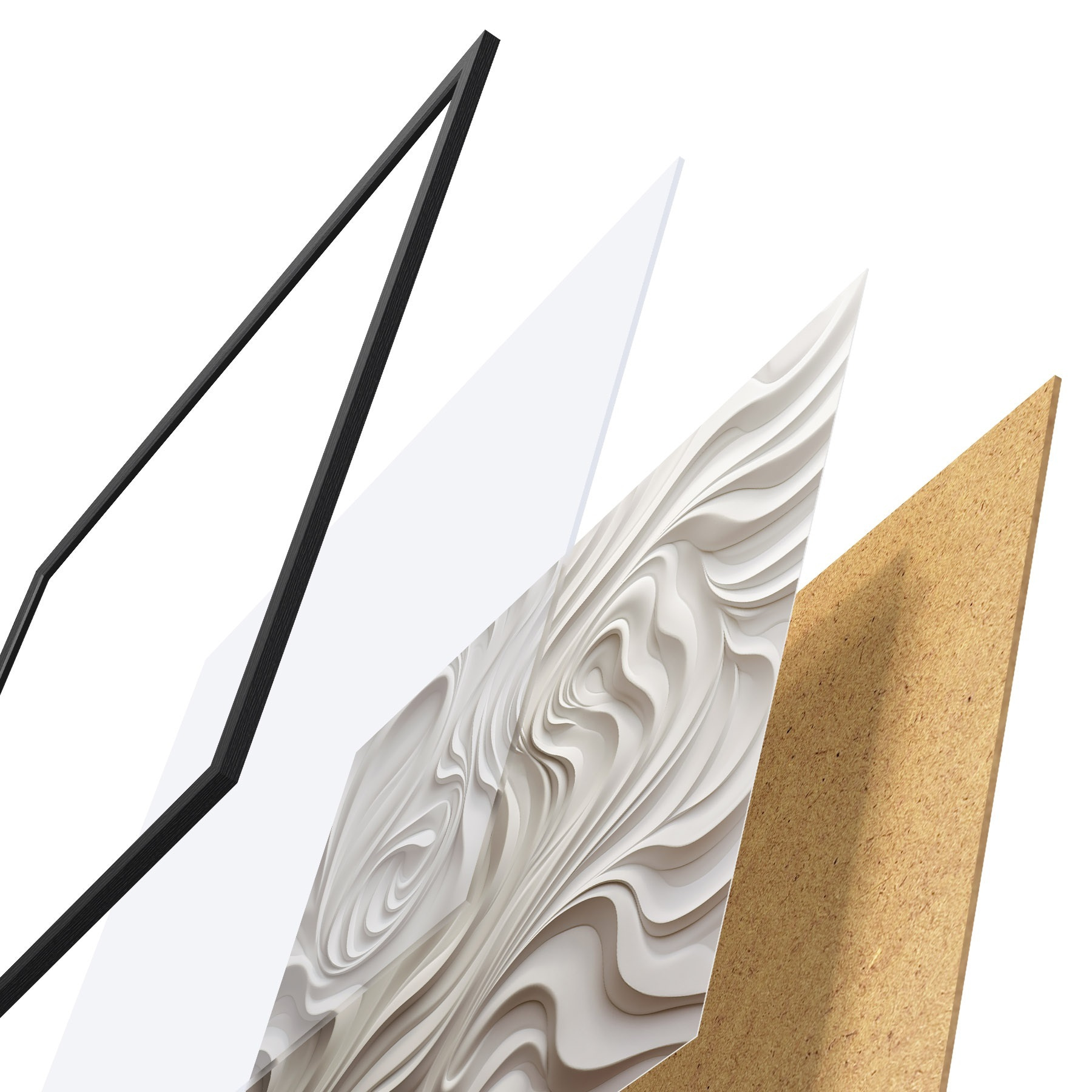 De poster bestaat uit een frame, plexiglas, geprinte afbeelding en spaanplaat achterkant. De poster kan meteen aan de muur worden gehangen dankzij de bevestigingen op de achterkant.