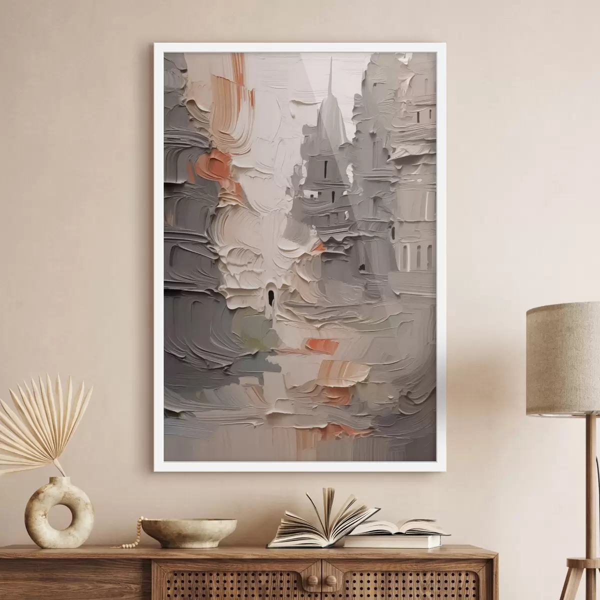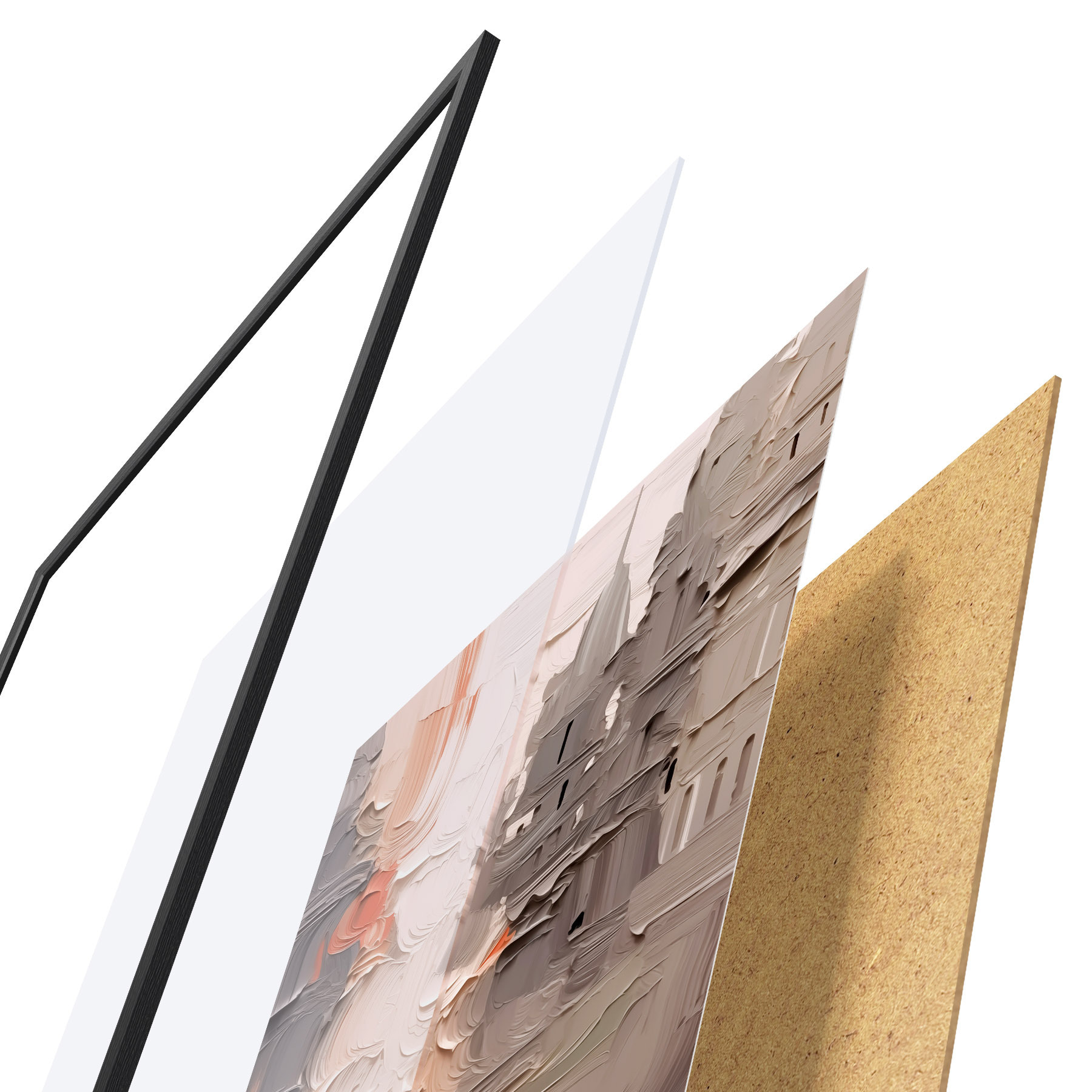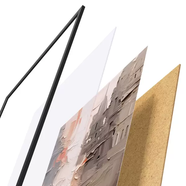 De poster bestaat uit een frame, plexiglas, geprinte afbeelding en spaanplaat achterkant. De poster kan meteen aan de muur worden gehangen dankzij de bevestigingen op de achterkant.