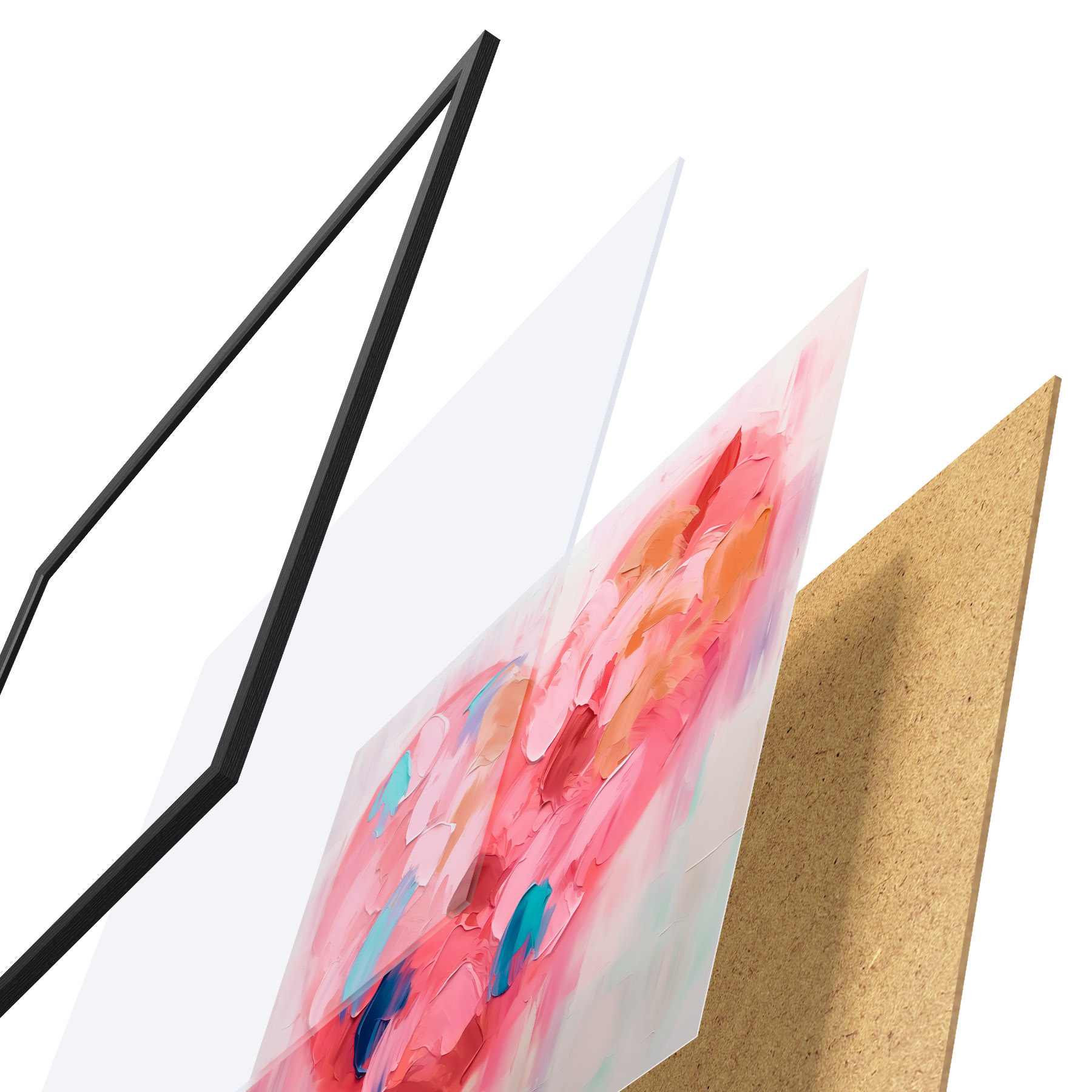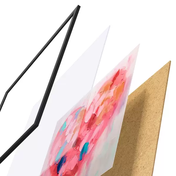 De poster bestaat uit een frame, plexiglas, geprinte afbeelding en spaanplaat achterkant. De poster kan meteen aan de muur worden gehangen dankzij de bevestigingen op de achterkant.
