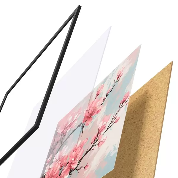 De poster bestaat uit een frame, plexiglas, geprinte afbeelding en spaanplaat achterkant. De poster kan meteen aan de muur worden gehangen dankzij de bevestigingen op de achterkant.