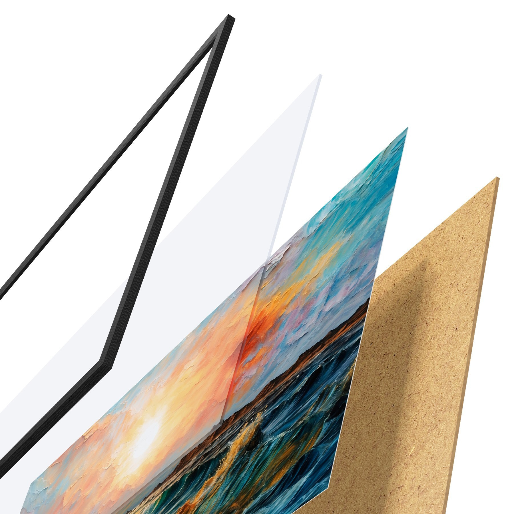 De poster bestaat uit een frame, plexiglas, geprinte afbeelding en spaanplaat achterkant. De poster kan meteen aan de muur worden gehangen dankzij de bevestigingen op de achterkant.