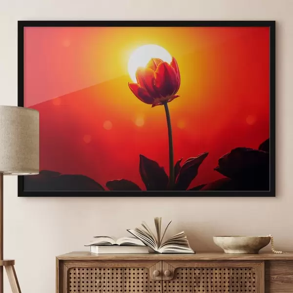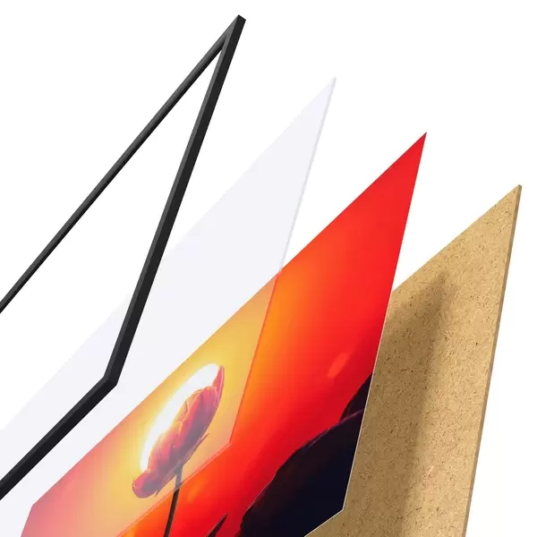 De poster bestaat uit een frame, plexiglas, geprinte afbeelding en spaanplaat achterkant. De poster kan meteen aan de muur worden gehangen dankzij de bevestigingen op de achterkant.