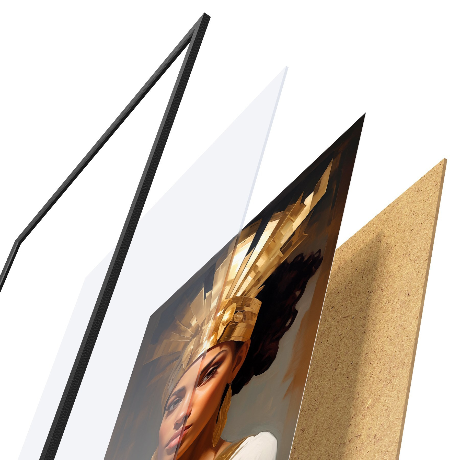 De poster bestaat uit een frame, plexiglas, geprinte afbeelding en spaanplaat achterkant. De poster kan meteen aan de muur worden gehangen dankzij de bevestigingen op de achterkant.