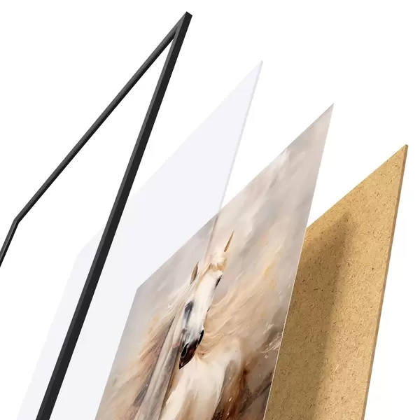 De poster bestaat uit een frame, plexiglas, geprinte afbeelding en spaanplaat achterkant. De poster kan meteen aan de muur worden gehangen dankzij de bevestigingen op de achterkant.
