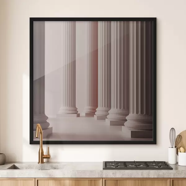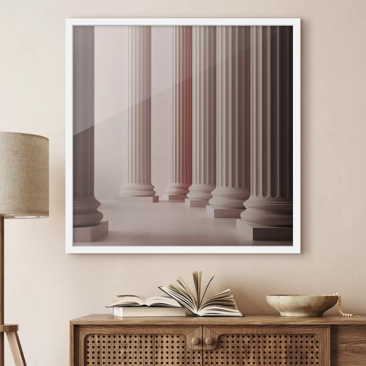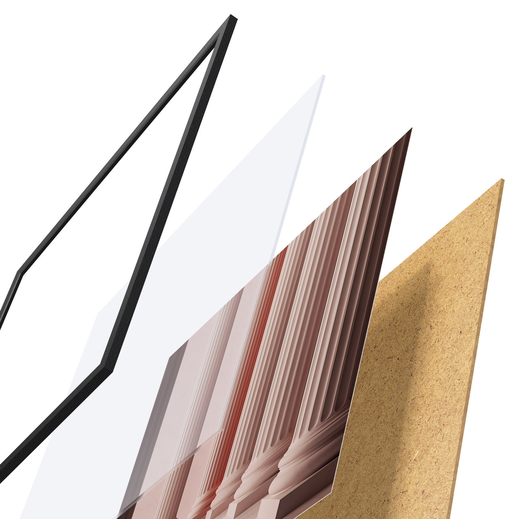 De poster bestaat uit een frame, plexiglas, geprinte afbeelding en spaanplaat achterkant. De poster kan meteen aan de muur worden gehangen dankzij de bevestigingen op de achterkant.