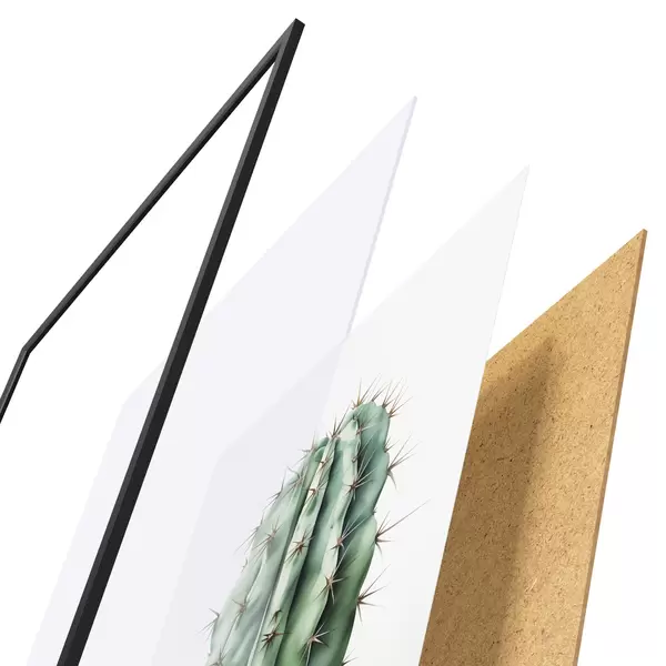 De poster bestaat uit een frame, plexiglas, geprinte afbeelding en spaanplaat achterkant. De poster kan meteen aan de muur worden gehangen dankzij de bevestigingen op de achterkant.