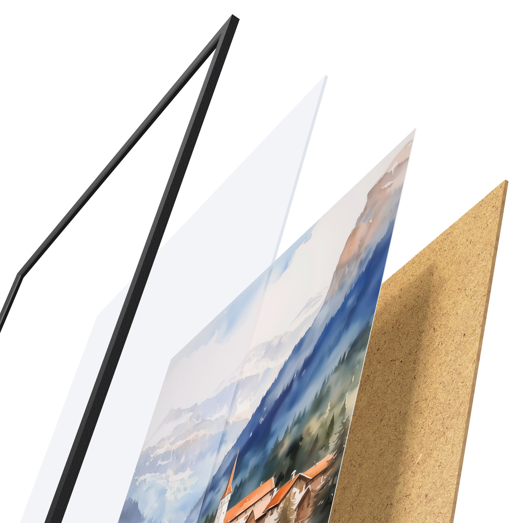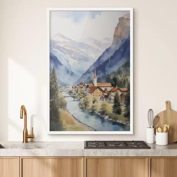 Poster Dorp bij de bergen imitatie aquarel f42964