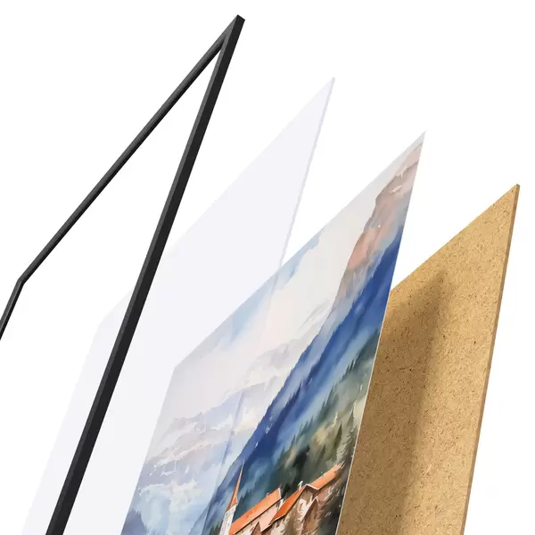 De poster bestaat uit een frame, plexiglas, geprinte afbeelding en spaanplaat achterkant. De poster kan meteen aan de muur worden gehangen dankzij de bevestigingen op de achterkant.