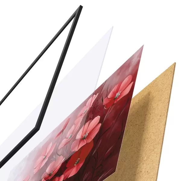 De poster bestaat uit een frame, plexiglas, geprinte afbeelding en spaanplaat achterkant. De poster kan meteen aan de muur worden gehangen dankzij de bevestigingen op de achterkant.