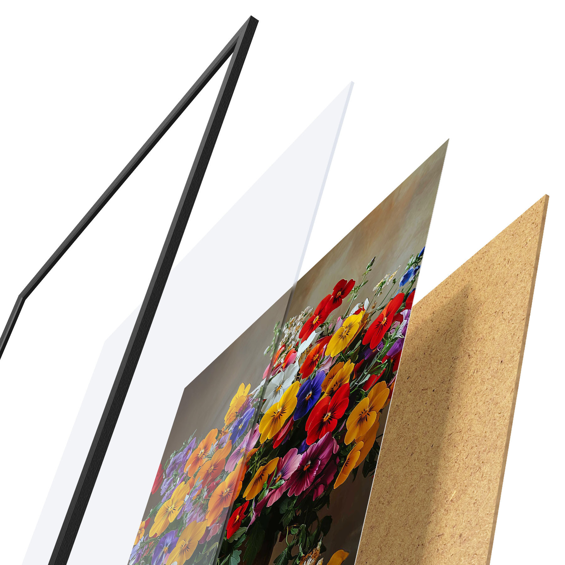 De poster bestaat uit een frame, plexiglas, geprinte afbeelding en spaanplaat achterkant. De poster kan meteen aan de muur worden gehangen dankzij de bevestigingen op de achterkant.