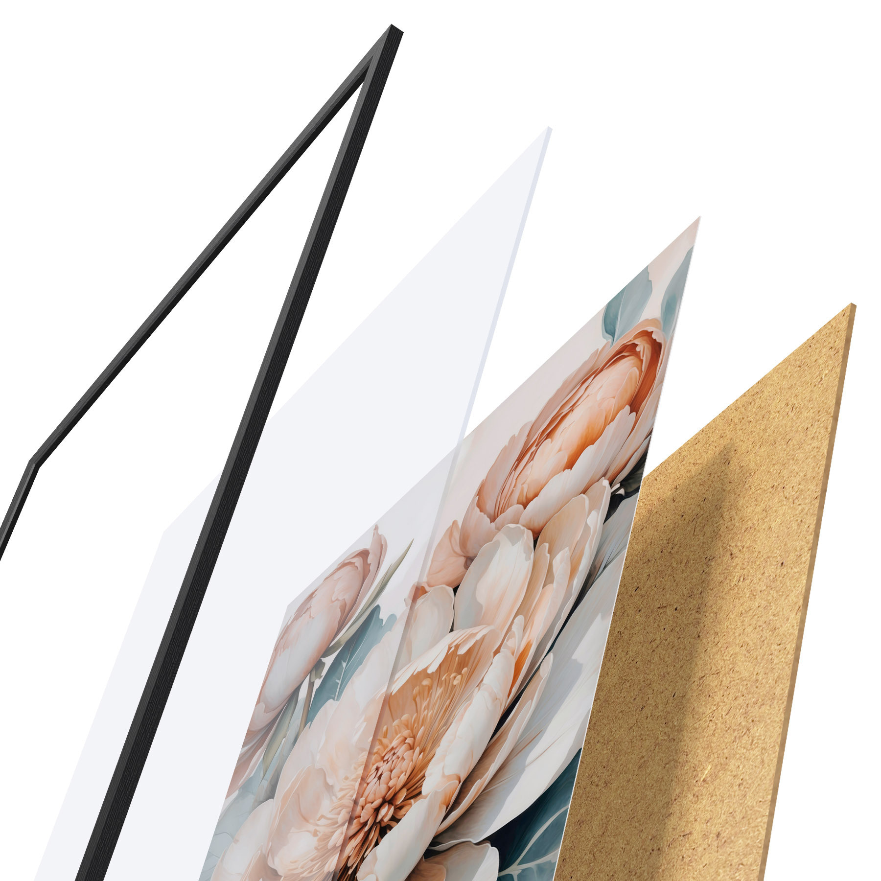 De poster bestaat uit een frame, plexiglas, geprinte afbeelding en spaanplaat achterkant. De poster kan meteen aan de muur worden gehangen dankzij de bevestigingen op de achterkant.