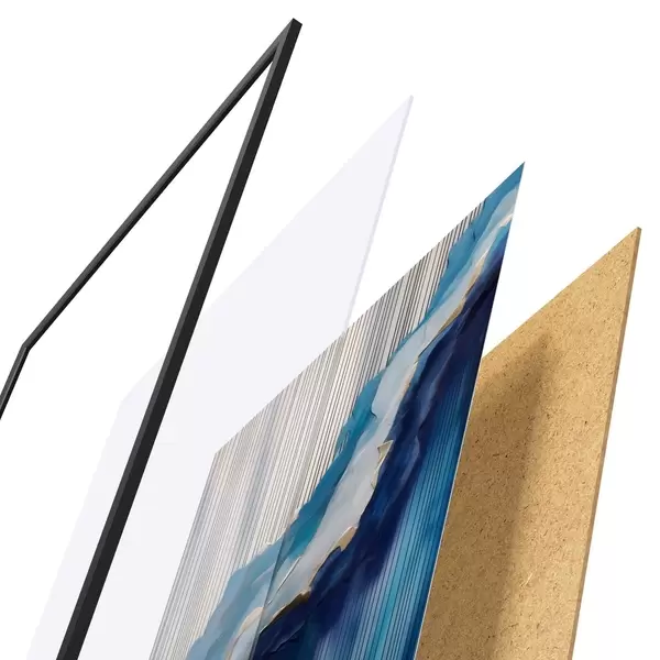 De poster bestaat uit een frame, plexiglas, geprinte afbeelding en spaanplaat achterkant. De poster kan meteen aan de muur worden gehangen dankzij de bevestigingen op de achterkant.
