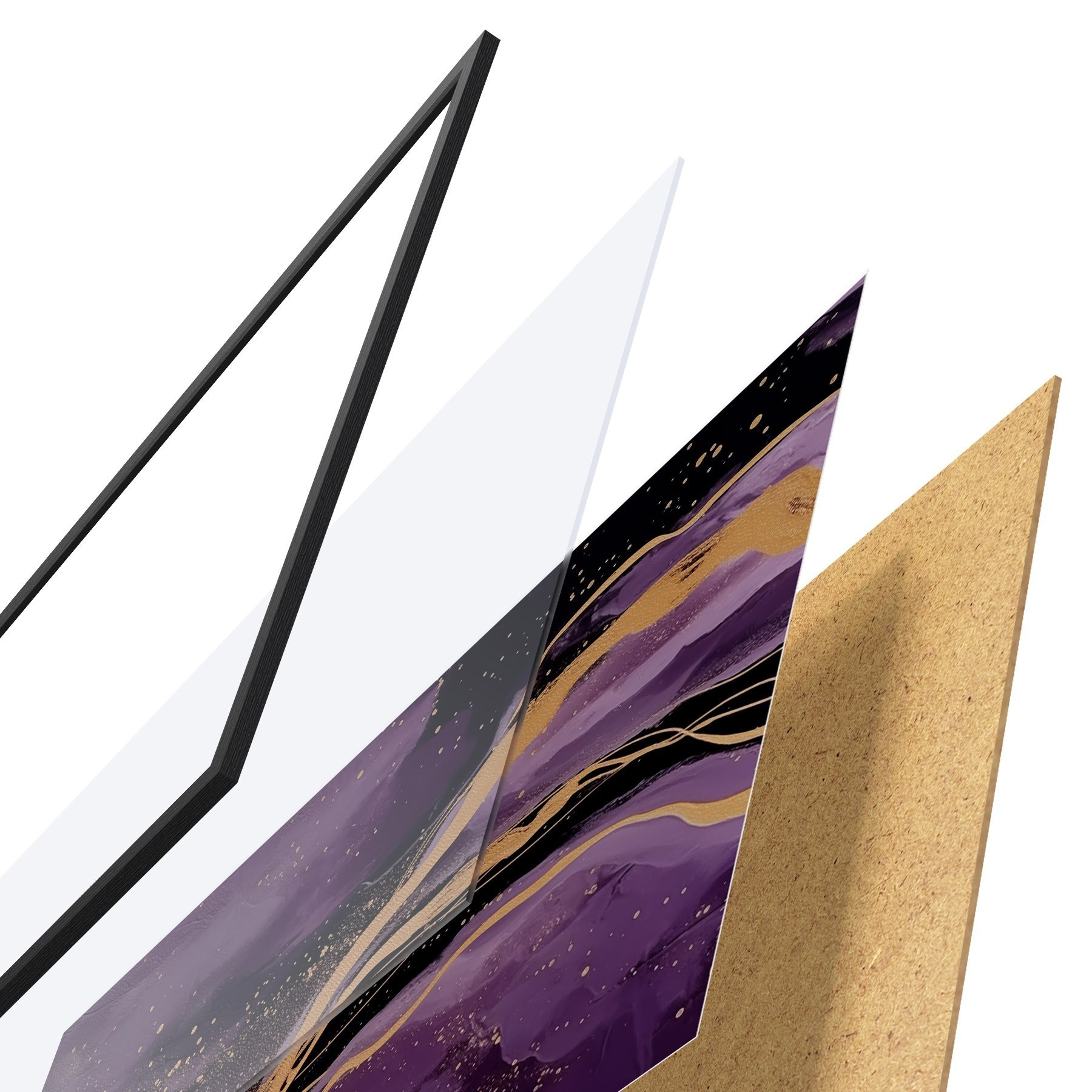 De poster bestaat uit een frame, plexiglas, geprinte afbeelding en spaanplaat achterkant. De poster kan meteen aan de muur worden gehangen dankzij de bevestigingen op de achterkant.