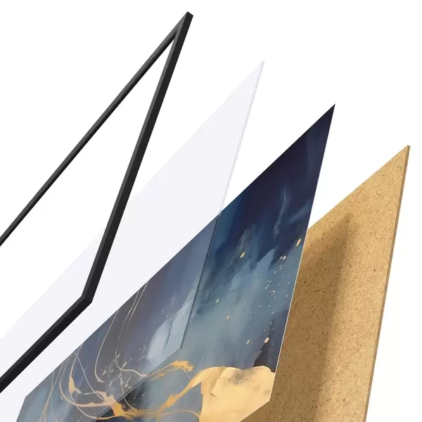 De poster bestaat uit een frame, plexiglas, geprinte afbeelding en spaanplaat achterkant. De poster kan meteen aan de muur worden gehangen dankzij de bevestigingen op de achterkant.
