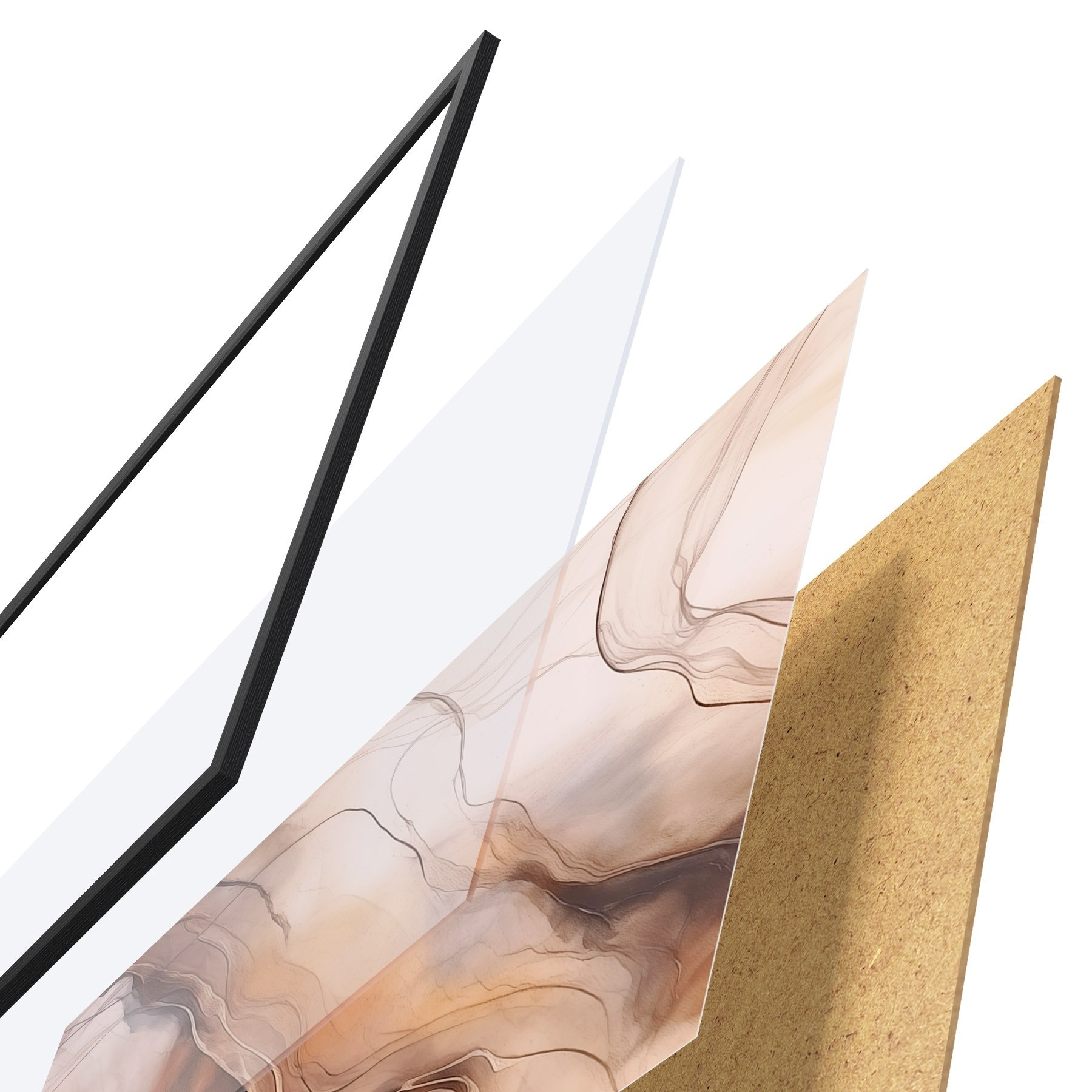De poster bestaat uit een frame, plexiglas, geprinte afbeelding en spaanplaat achterkant. De poster kan meteen aan de muur worden gehangen dankzij de bevestigingen op de achterkant.