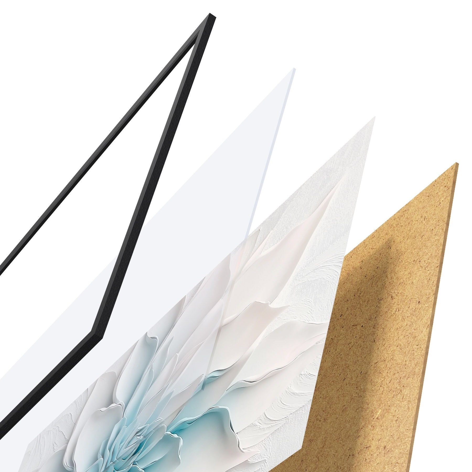 De poster bestaat uit een frame, plexiglas, geprinte afbeelding en spaanplaat achterkant. De poster kan meteen aan de muur worden gehangen dankzij de bevestigingen op de achterkant.