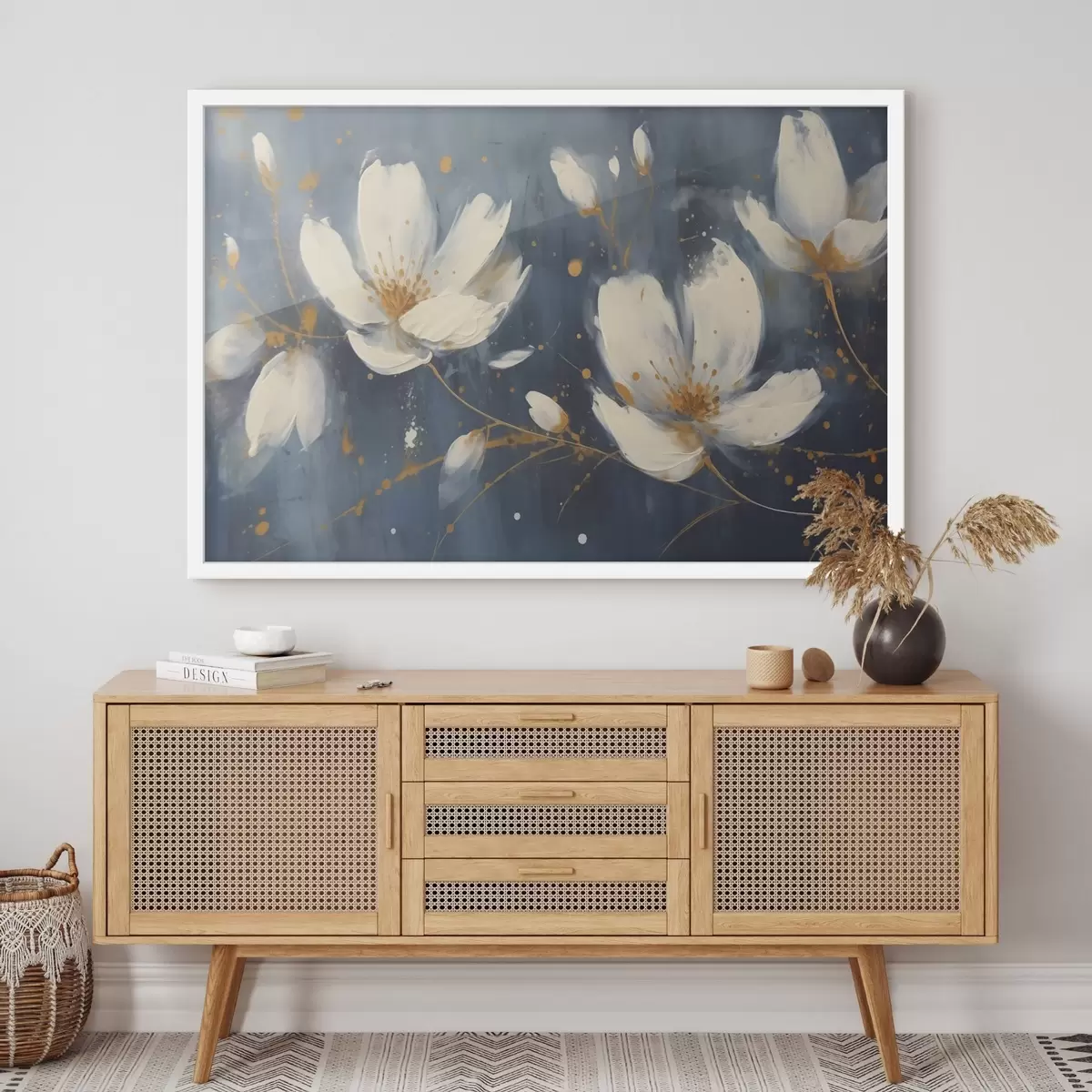 Poster Witte bloemen op een blauwe achtergrond f43025