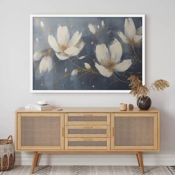 Poster Witte bloemen op een blauwe achtergrond Nr f43025