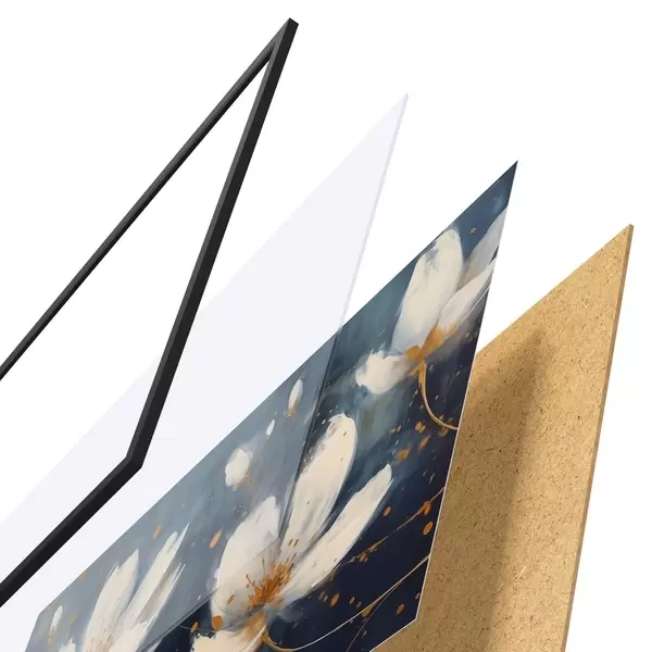 De poster bestaat uit een frame, plexiglas, geprinte afbeelding en spaanplaat achterkant. De poster kan meteen aan de muur worden gehangen dankzij de bevestigingen op de achterkant.