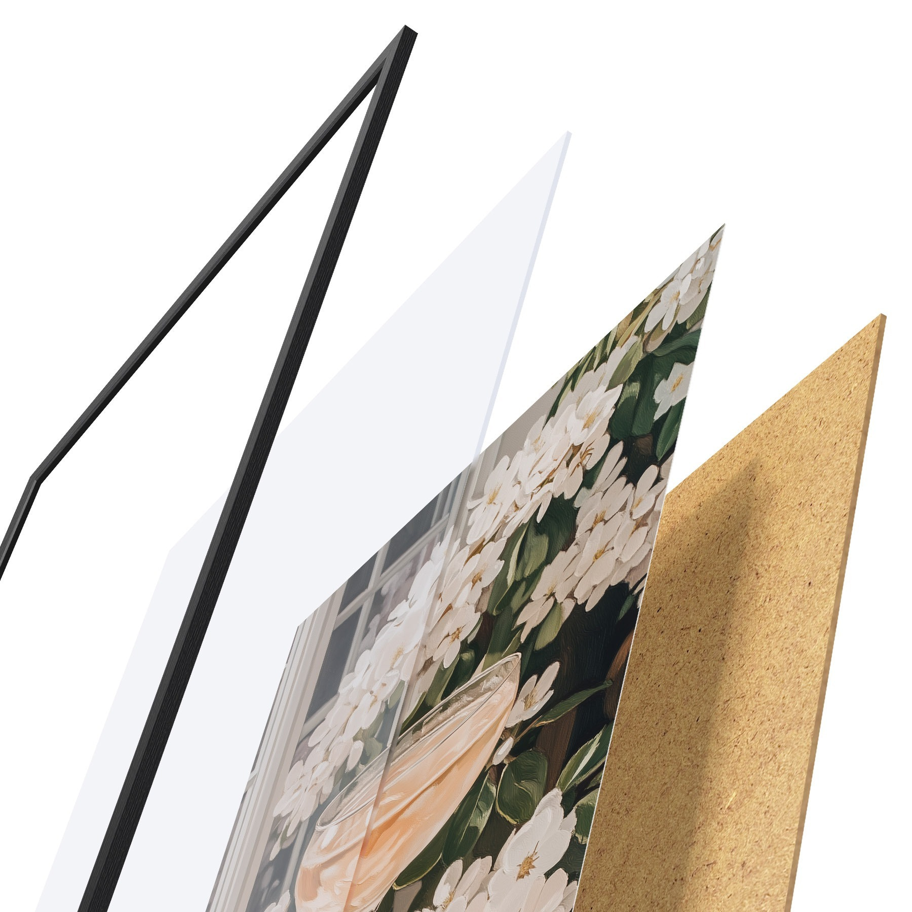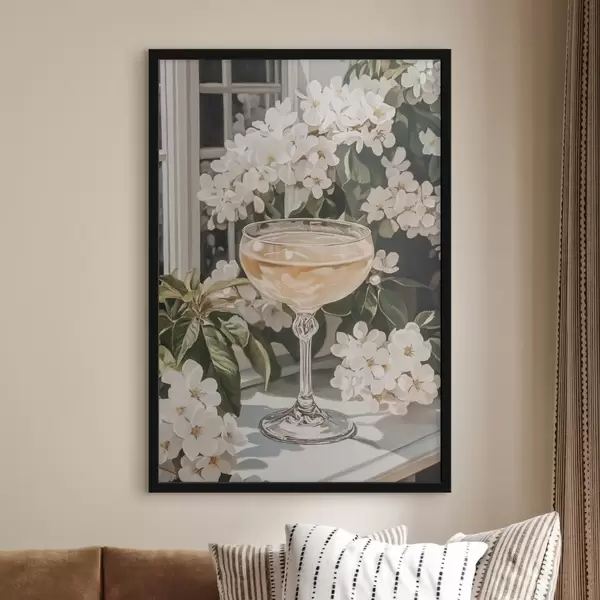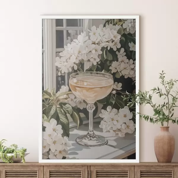Poster Glas champagne, vintage, aquarelstijl, witte bloemen Nr f43051