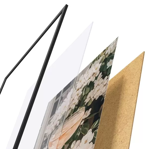 De poster bestaat uit een frame, plexiglas, geprinte afbeelding en spaanplaat achterkant. De poster kan meteen aan de muur worden gehangen dankzij de bevestigingen op de achterkant.
