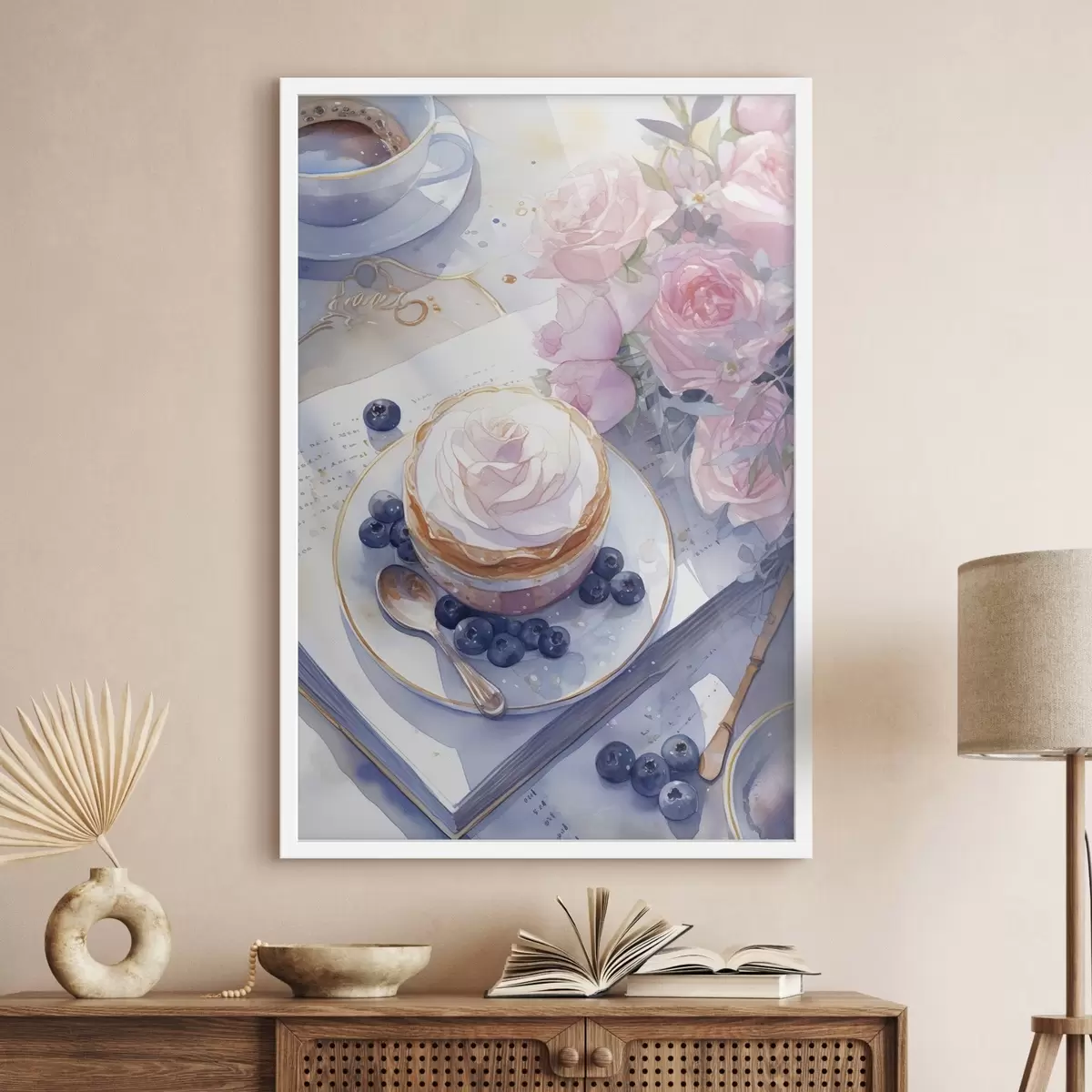 Poster Bosbessen cupcake, boho stijl, aquarel, roze rozen, poëtisch Nr f43053