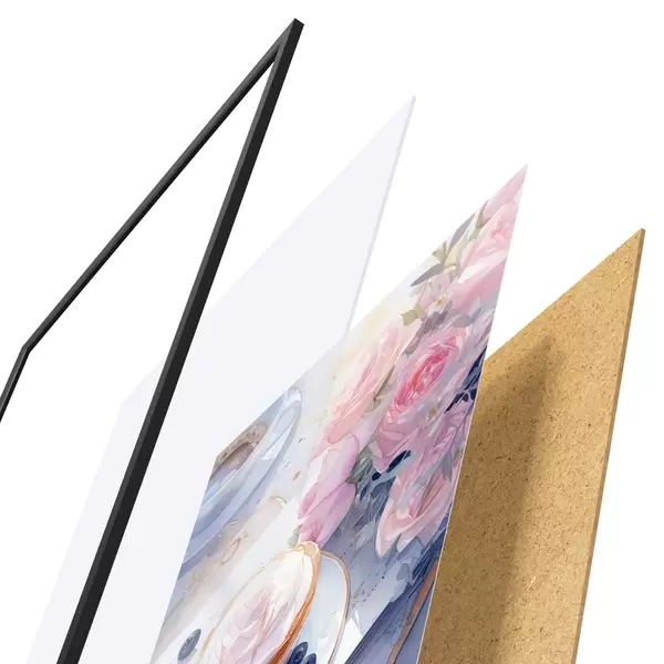 De poster bestaat uit een frame, plexiglas, geprinte afbeelding en spaanplaat achterkant. De poster kan meteen aan de muur worden gehangen dankzij de bevestigingen op de achterkant.