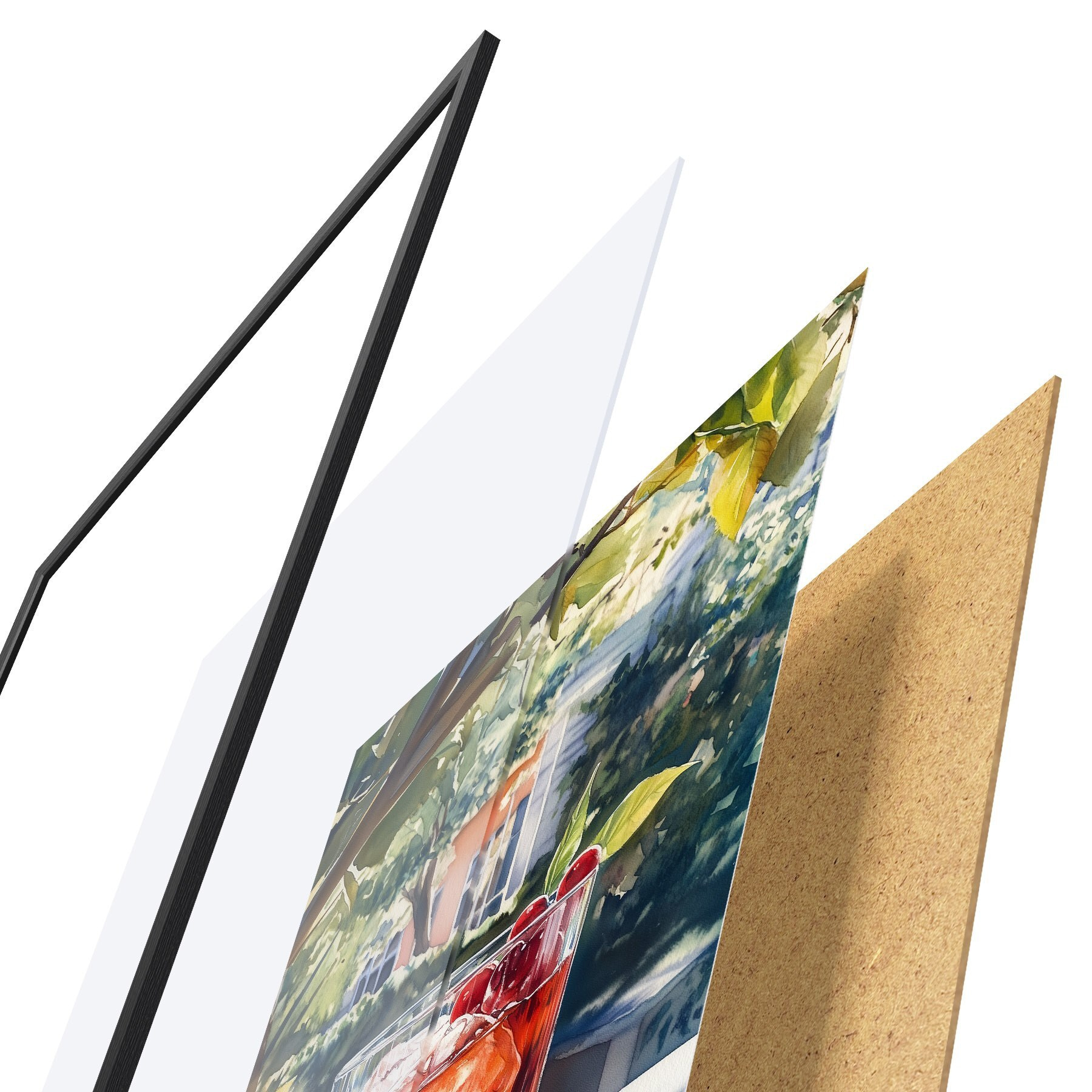 De poster bestaat uit een frame, plexiglas, geprinte afbeelding en spaanplaat achterkant. De poster kan meteen aan de muur worden gehangen dankzij de bevestigingen op de achterkant.