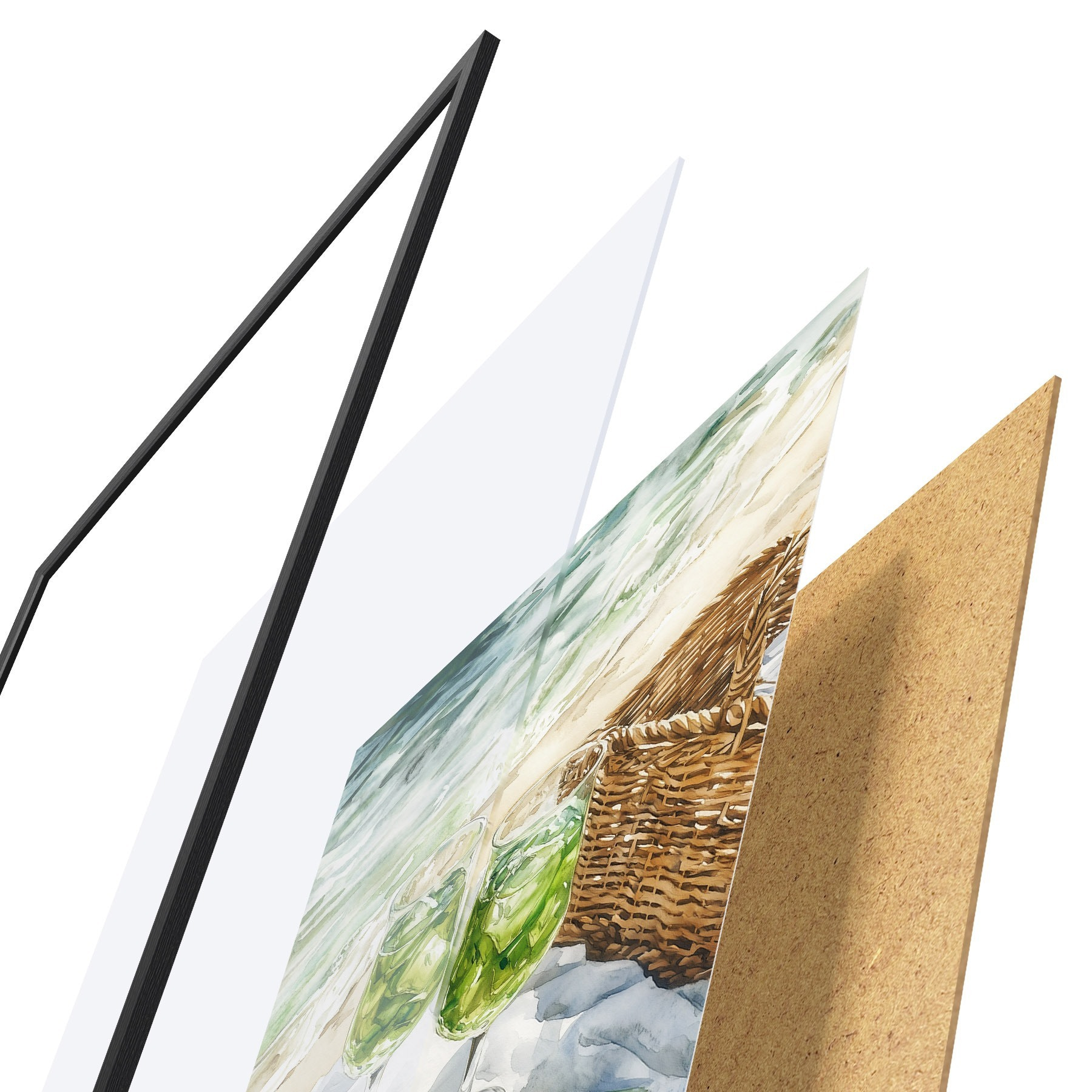 De poster bestaat uit een frame, plexiglas, geprinte afbeelding en spaanplaat achterkant. De poster kan meteen aan de muur worden gehangen dankzij de bevestigingen op de achterkant.
