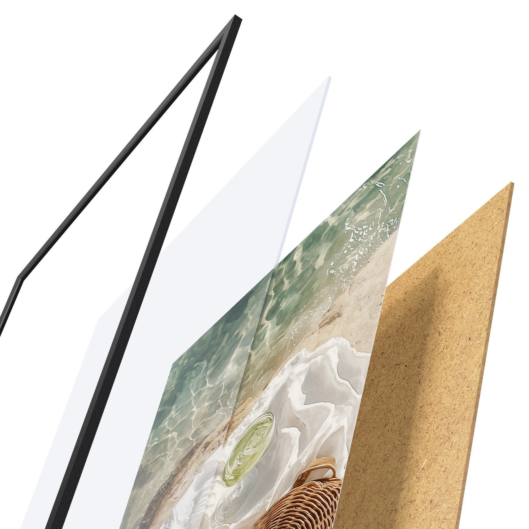 De poster bestaat uit een frame, plexiglas, geprinte afbeelding en spaanplaat achterkant. De poster kan meteen aan de muur worden gehangen dankzij de bevestigingen op de achterkant.