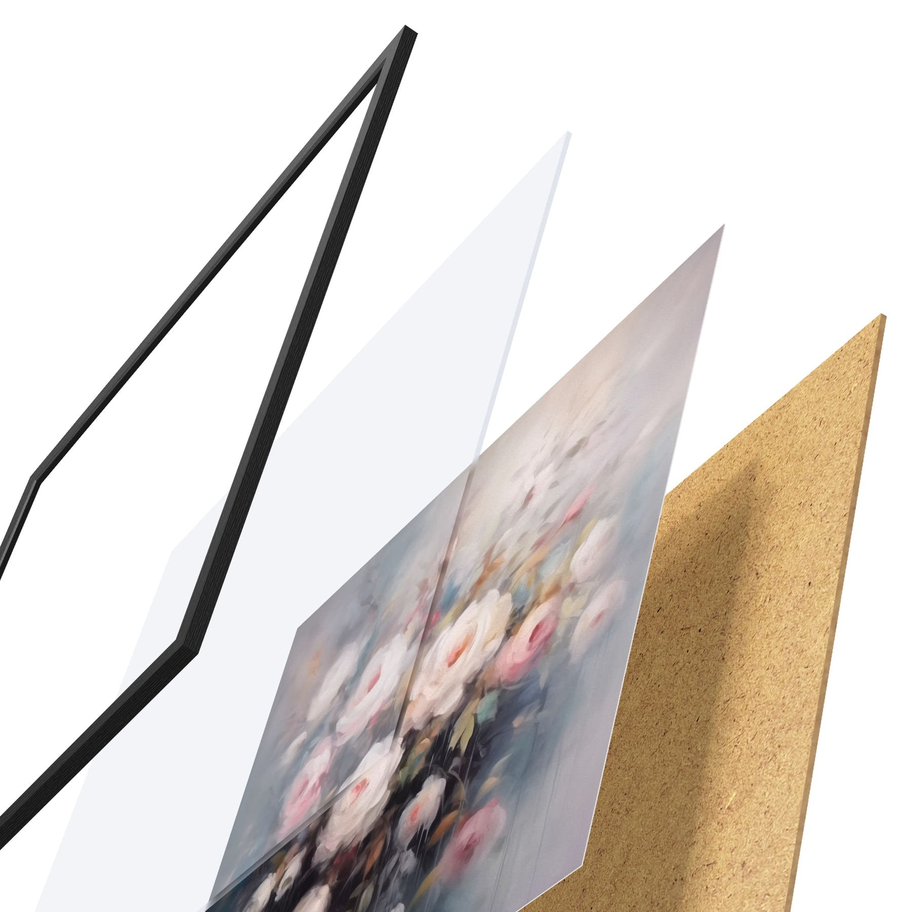 De poster bestaat uit een frame, plexiglas, geprinte afbeelding en spaanplaat achterkant. De poster kan meteen aan de muur worden gehangen dankzij de bevestigingen op de achterkant.