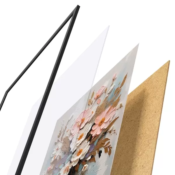 De poster bestaat uit een frame, plexiglas, geprinte afbeelding en spaanplaat achterkant. De poster kan meteen aan de muur worden gehangen dankzij de bevestigingen op de achterkant.