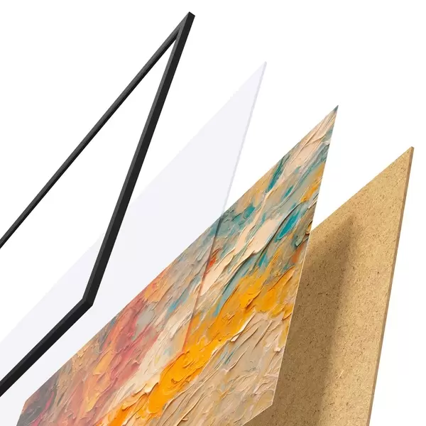 De poster bestaat uit een frame, plexiglas, geprinte afbeelding en spaanplaat achterkant. De poster kan meteen aan de muur worden gehangen dankzij de bevestigingen op de achterkant.