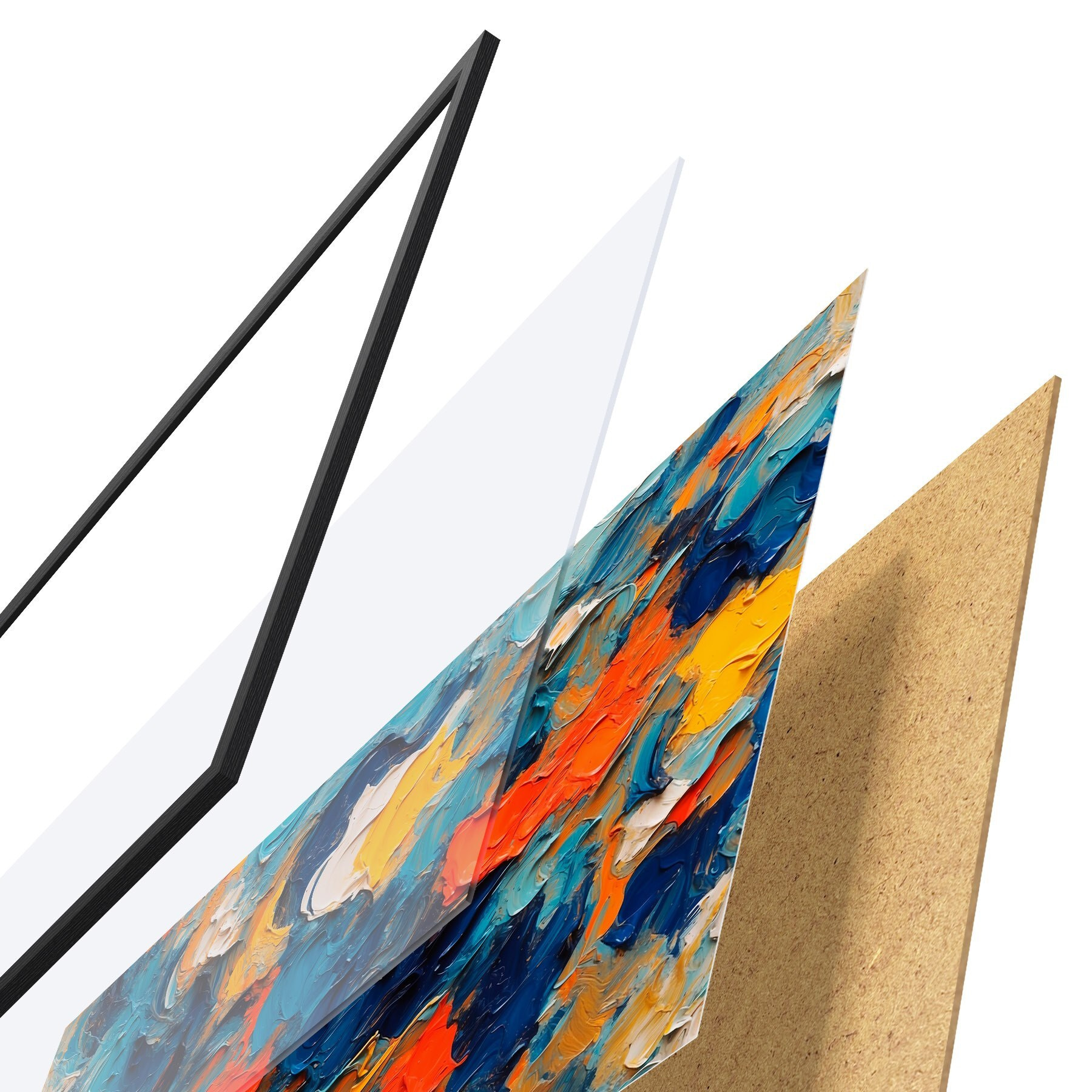De poster bestaat uit een frame, plexiglas, geprinte afbeelding en spaanplaat achterkant. De poster kan meteen aan de muur worden gehangen dankzij de bevestigingen op de achterkant.