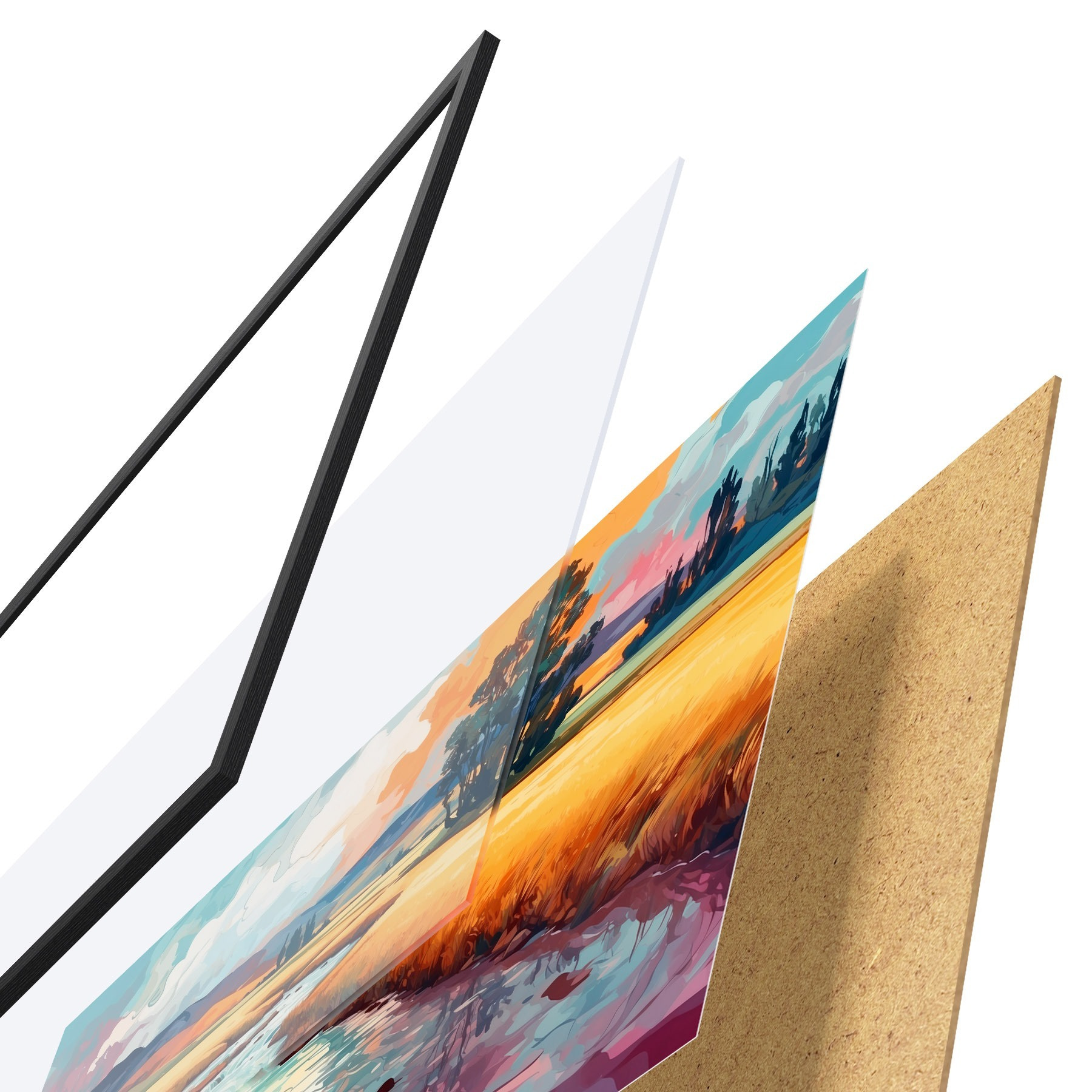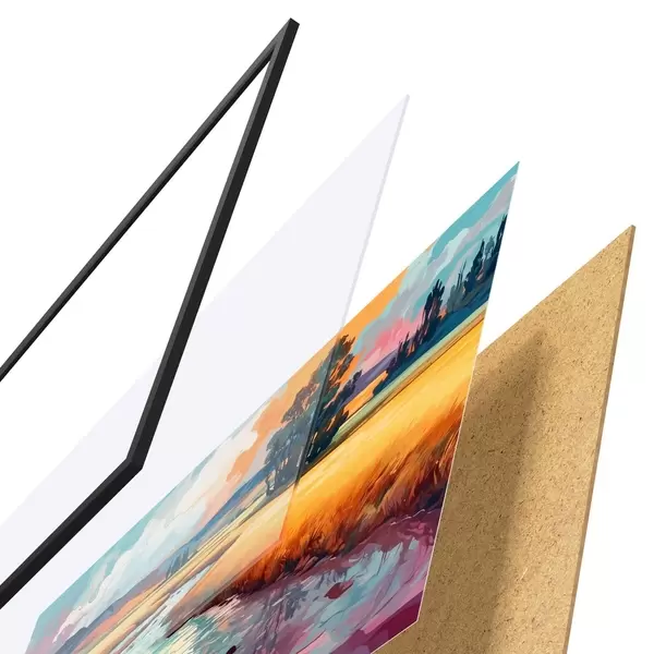 De poster bestaat uit een frame, plexiglas, geprinte afbeelding en spaanplaat achterkant. De poster kan meteen aan de muur worden gehangen dankzij de bevestigingen op de achterkant.
