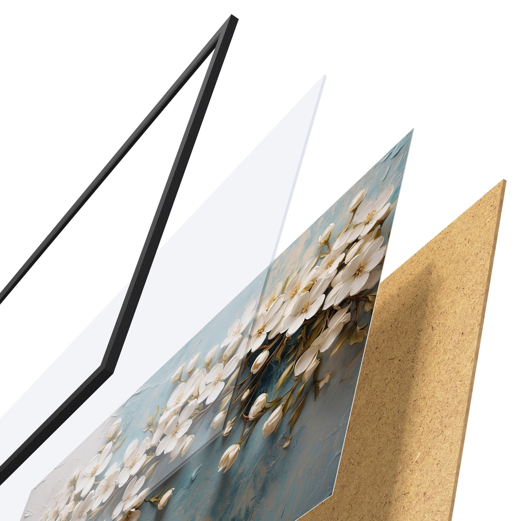 De poster bestaat uit een frame, plexiglas, geprinte afbeelding en spaanplaat achterkant. De poster kan meteen aan de muur worden gehangen dankzij de bevestigingen op de achterkant.