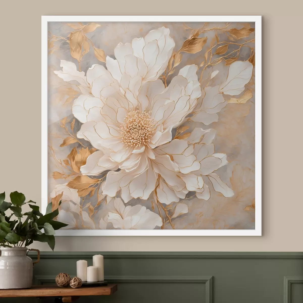 Poster Witte bloem met bladeren in acrylschilderstijl f43115
