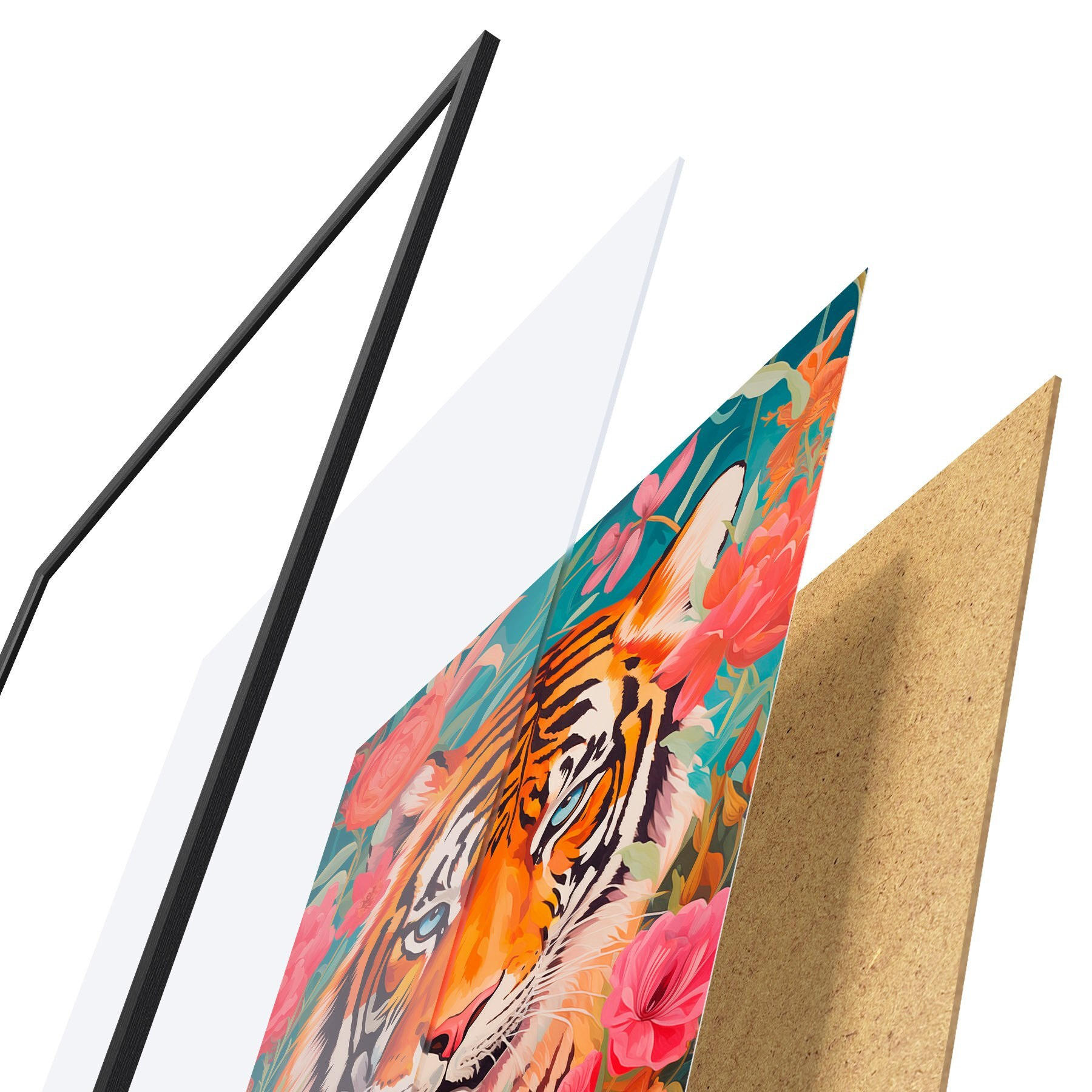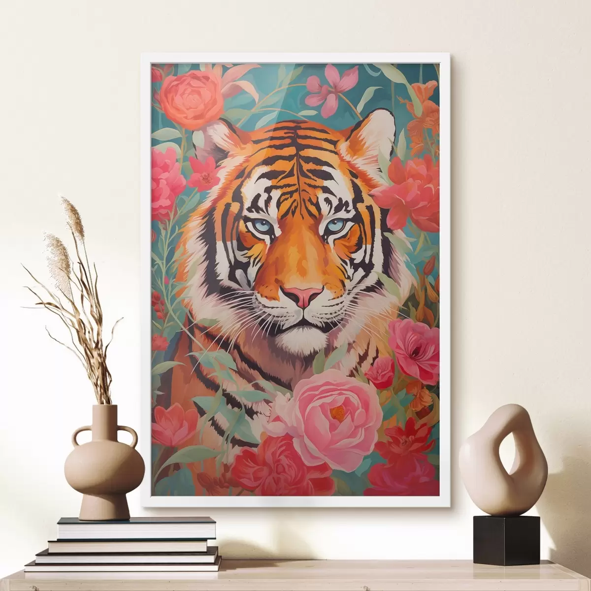 Poster De betoverende blik van een tijger te midden van levendige rozen Nr f43132