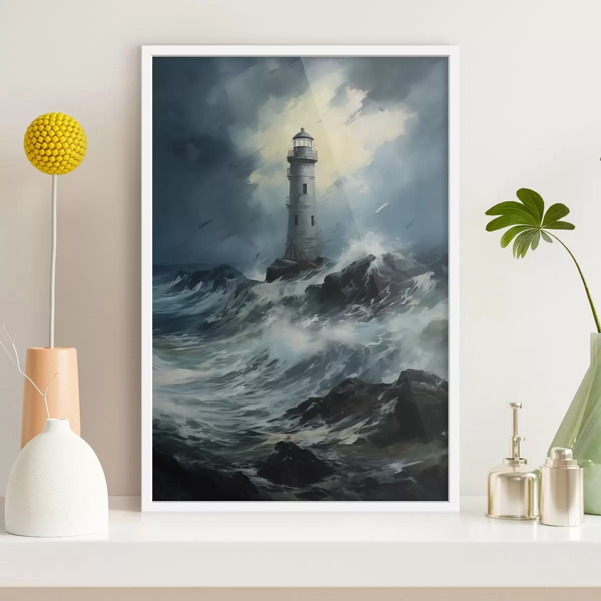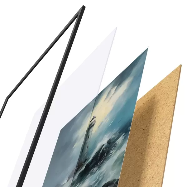 De poster bestaat uit een frame, plexiglas, geprinte afbeelding en spaanplaat achterkant. De poster kan meteen aan de muur worden gehangen dankzij de bevestigingen op de achterkant.