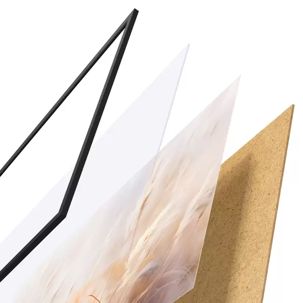 De poster bestaat uit een frame, plexiglas, geprinte afbeelding en spaanplaat achterkant. De poster kan meteen aan de muur worden gehangen dankzij de bevestigingen op de achterkant.