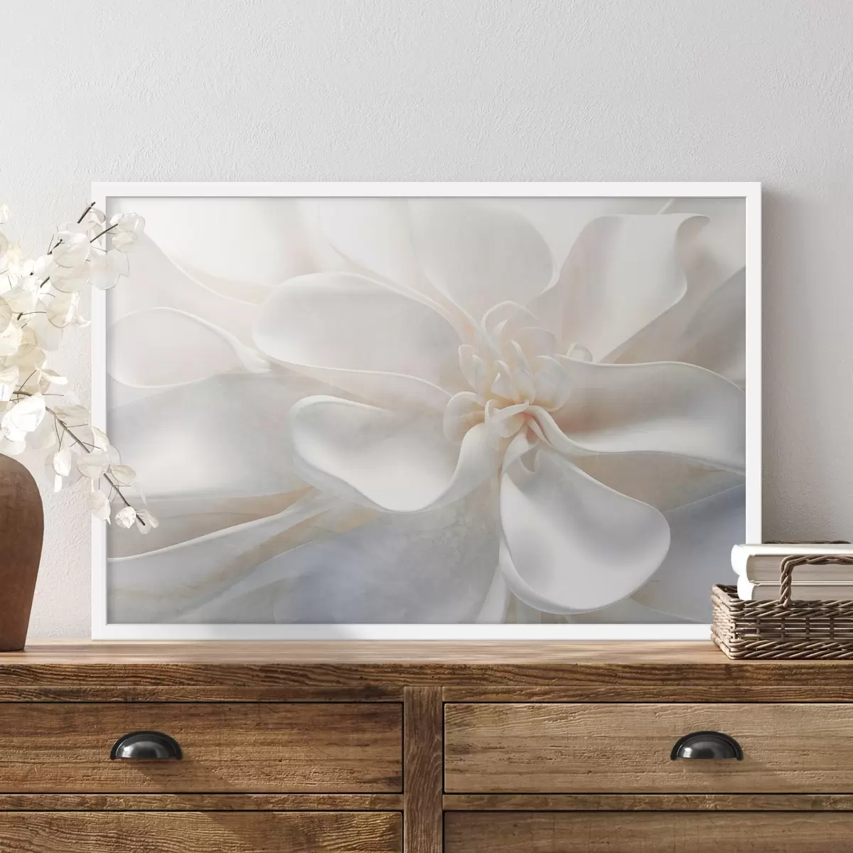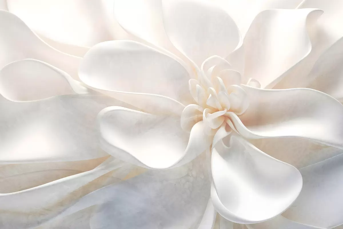Poster Close-up van een heldere witte abstracte bloem met fijne bloemblaadjes in pastelkleuren Nr f43161