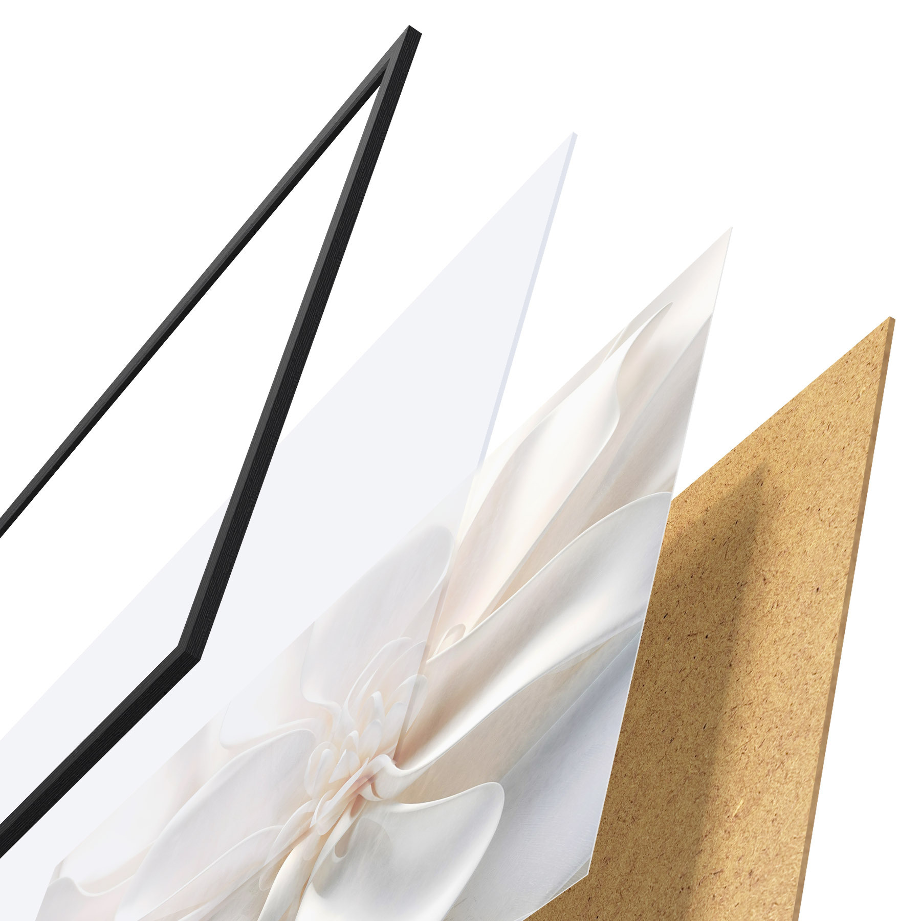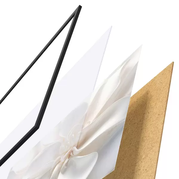 De poster bestaat uit een frame, plexiglas, geprinte afbeelding en spaanplaat achterkant. De poster kan meteen aan de muur worden gehangen dankzij de bevestigingen op de achterkant.