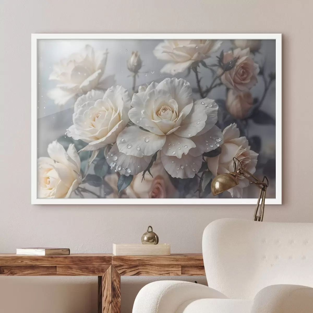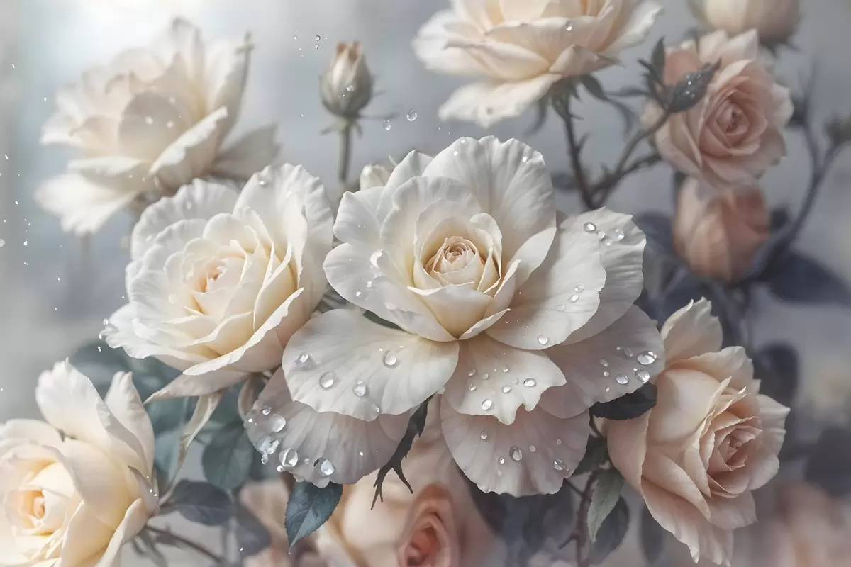 Poster Een groep witte rozen met waterdruppels op de bloemblaadjes, wat groene bladeren, gedempte achtergrond, zacht licht Nr f43163