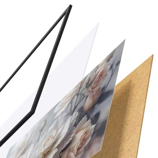 De poster bestaat uit een frame, plexiglas, geprinte afbeelding en spaanplaat achterkant. De poster kan meteen aan de muur worden gehangen dankzij de bevestigingen op de achterkant.