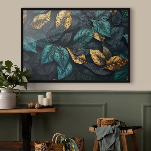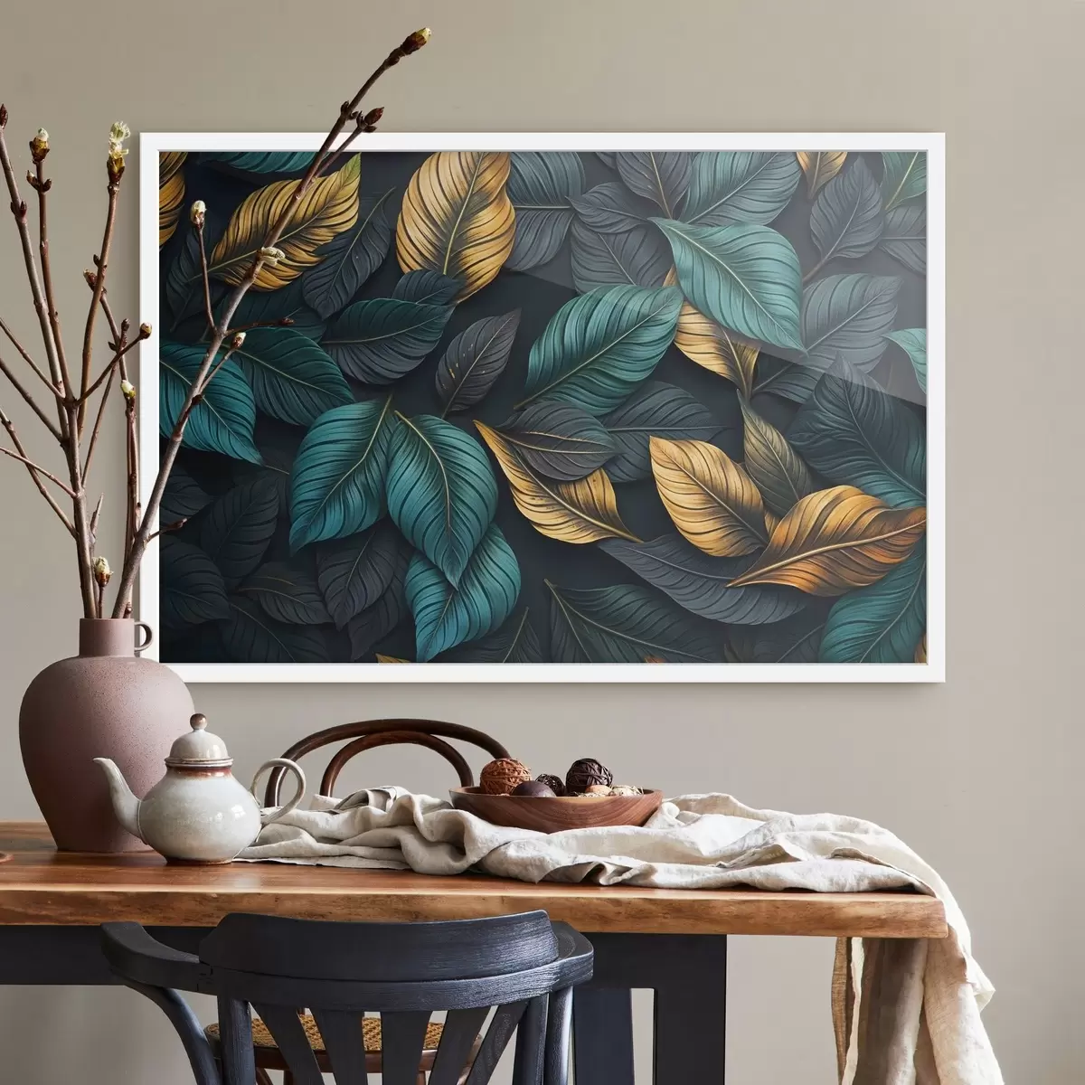 Poster Donkergroen, geel en zwart blad met donkere nerven, op een donkere achtergrond, elegante tropische vibe Nr f43164