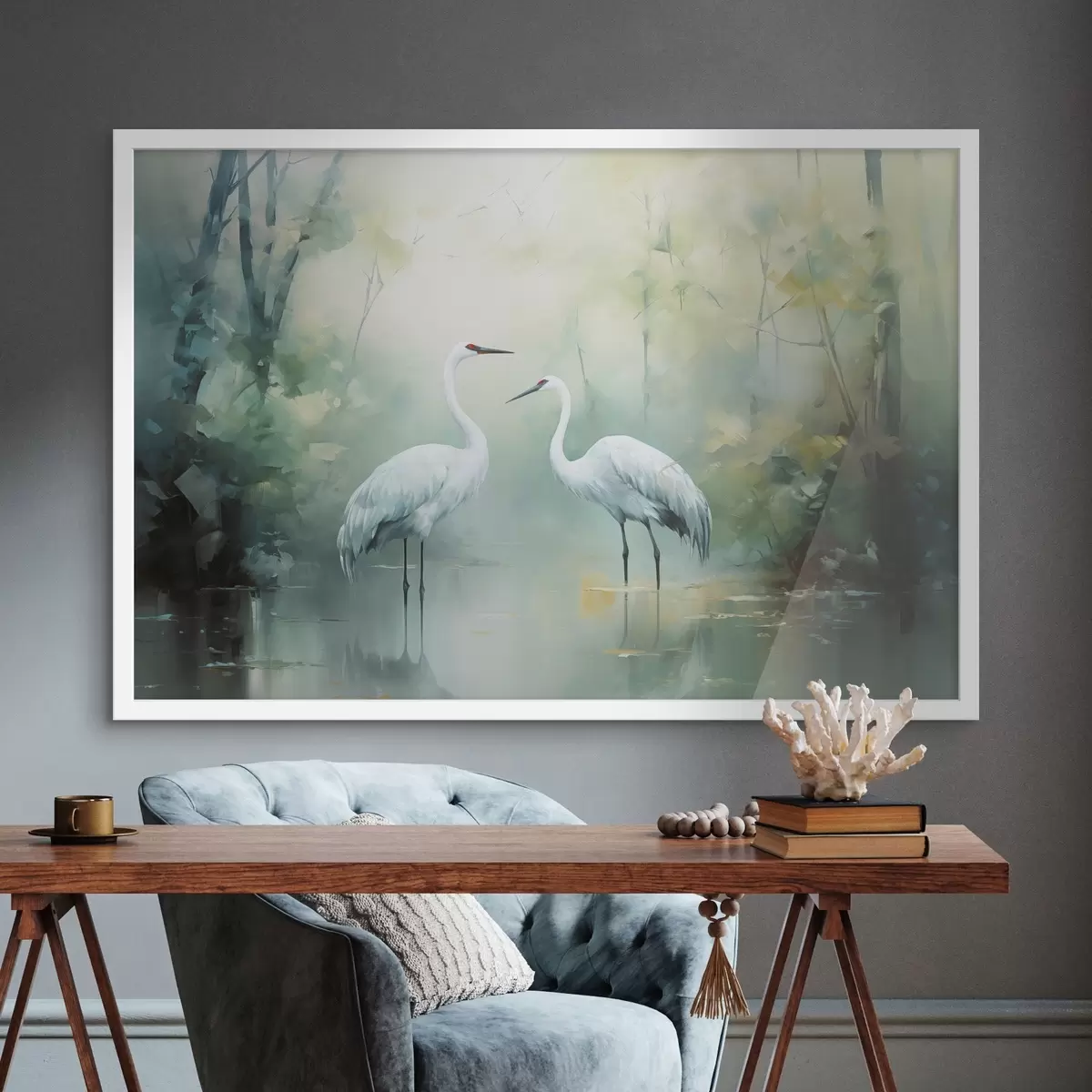 Poster Twee witte kraanvogels in een vijver, omringd door een weelderig groen bos met zachte, diffuse verlichting Nr f43166
