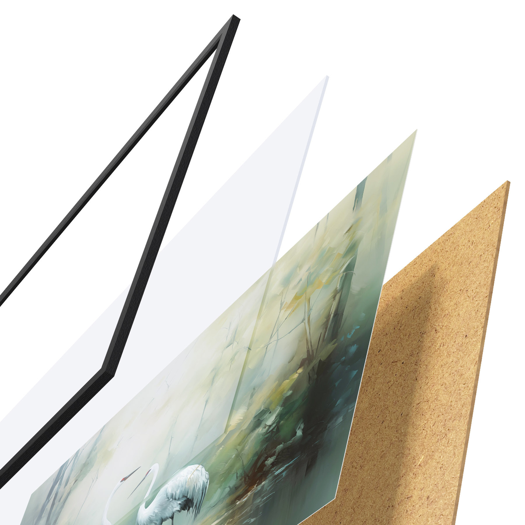 De poster bestaat uit een frame, plexiglas, geprinte afbeelding en spaanplaat achterkant. De poster kan meteen aan de muur worden gehangen dankzij de bevestigingen op de achterkant.